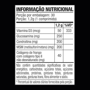 Ingredientes: glucosamina, condroitina, msm, colágeno de frango com colageno tipo ii não desnaturado, vitamina d3 e estabilizantes amido de milho e polivinilpirrolidona e antiumectante dióxito de silício.