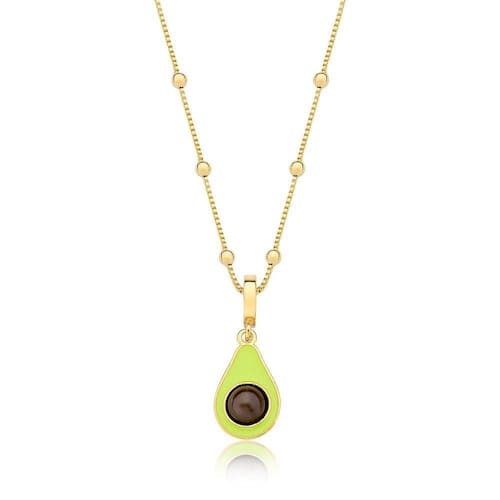 Nosso Colar Abacate traz uma linda pérola cintilante e detalhes esmaltados na cor da fruta. Seu revestimento em Ouro garante o toque final à esta peça. Sua corrente veneziana possui pequenas esferas que acrescentam charme e beleza.