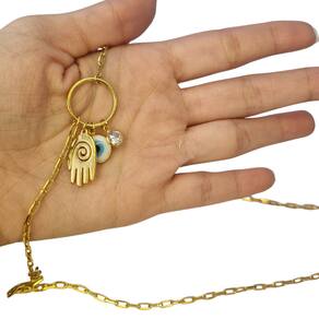 O Colar Amuleto Hansa Olho Grego Coração da Bialluz é folheado garantindo alta resistência e durabilidade. A corrente conta com um lindo pingente que emanará ótimas energias em sua vida. É uma maravilhosa opção de presente, com certeza a pessoa que receberá sentirá muita gratidão por ter uma peça tão bela.