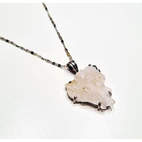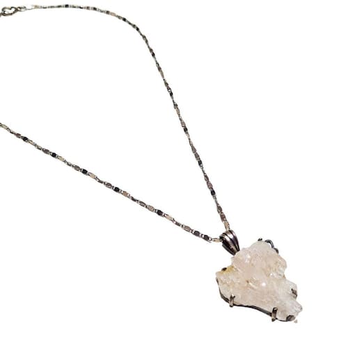 Colar feito com cristal de Quartzo e detalhes em metal com banho prateado. Peça trabalhada à mão. Pingente com aproximadamente 5cm. Confortável e leve, a corrente possui 50cm de circunferência. Acabamento de qualidade. Peso: 15g Design exclusivo.