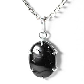 Pingente Cabochão Oval Pedra Turmalina Preta 12mm Montagem na garra com perinha em Prata 950 para passar o cordão Pedra Genuina com origem garimpo lapidação e montagem manual Observação Por ser Turmalina Preta Natural pode ter Trincas e Marcas na peça devido sua dureza mas nada que inultilize a peça, pingentes não passivo de troca só compre após ler e entender isso