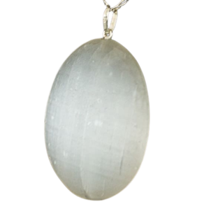 O colar apresenta uma selenita cabochão que brilha suavemente sob a luz, adicionando um toque de serenidade e beleza natural ao seu visual.
