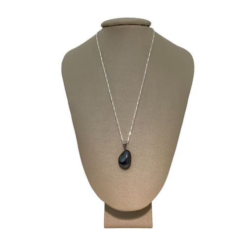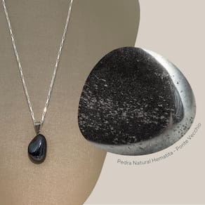 Beleza e Detalhes do Pingente: O pingente de Hematita apresenta um polimento fino que realça seu tom metálico cinza-escuro e os padrões prateados naturais, irradiando uma elegância sóbria.
