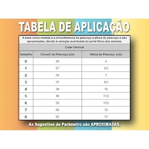 Colar Cervical Pet Med N° 1Colar protetor cervical Cães podem apresentar problemas de coluna em qualquer época da vida, principalmente quando idosos. A pet med oferece o colar protetor cervical confeccionado com tecido confortável. Uma alternativa para manter a imobilidade com muito conforto para o pet. Tudo para que a recuperação do seu amigo seja tranquila e sem estresse. Indicações Vale lembrar que a utilização do colar cervical requer orientação veterinária. Não deve ser utilizado como colar elisabetano, pois é específico para problemas cervicais. Instruções de uso: é fechado através de tiras autocolantesno dorso do animal. Atenção: para se obter o tamanho ideal, verifique a altura desde a base do pescoço até embaixo da orelha, além da circunferência do pescoço do animal. As referências de medidas de circunferência do pescoço e altura do pescoço são aproximadas, devido à variação acentuada do porte físico dos animais. Importante: supervisione o seu animal quando ele utilizar os colares protetores, pois cada animal reage de uma forma diferente. Embora a maioria dos animais não se incomode de usar os colares protetores, alguns poucos animais não se adaptam a quase nenhum acessório. Atenção: certifique-se de que os produtos estejam sempre secos, confortáveis e adequados ao tamanho do seu pet.