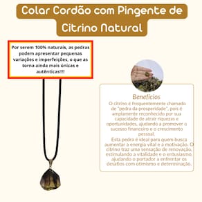Este colar com cordão e pingente de citrino natural é uma peça encantadora que combina a beleza do citrino com suas poderosas propriedades energéticas. O citrino é uma pedra conhecida por sua capacidade de atrair prosperidade, vitalidade e alegria. Ao ser utilizado como pingente, ele não só embeleza o visual, mas também serve como um amuleto que estimula a criatividade, promove o otimismo e fortalece o espírito de abundância.