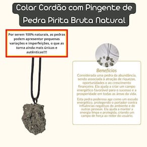 Colar Cordão com Pingente de Pedra Pirita Bruta Natural Colar Cordão com Pingente de Pedra Pirita Bruta Natural Este colar com cordão e pingente de pedra pirita bruta natural é uma peça única que une a beleza natural da pirita com suas propriedades energéticas poderosas. A pirita, também conhecida como ouro dos tolos, é uma pedra conhecida por sua capacidade de atrair abundância, prosperidade e proteger contra energias negativas. Ao ser Utilizado como pingente, ela não apenas se torna um acessório elegante, mas também serve como um amuleto de proteção e prosperidade, ajudando a manter o portador envolto em boas energias. Benefícios Energéticos: Atração de Prosperidade: A pirita é amplamente considerada uma pedra da abundância. Ela é associada à atração de riquezas e oportunidades, ajudando a promover o sucesso financeiro e o crescimento pessoal. Proteção contra Energias Negativas: A pirita é eficaz para criar um escudo energético contra energias negativas, tanto de pessoas quanto do ambiente. Usar este colar ajuda a manter a energia do portador limpa e protegida. Estímulo à Confiança e Coragem: Conhecida por aumentar a autoconfiança, a pirita ajuda a fortalecer o espírito, incentivando o portador a tomar decisões com coragem e firmeza. Enviamos em até 24 horas após a confirmação do pagamento Se você tiver alguma dúvida, não hesite em nos mandar uma mensagem Responderemos rapidamente para ajudá-lo da melhor forma possível Marca: Meta Atacado
