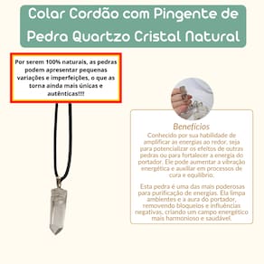 Este colar com cordão e pingente de pedra quartzo cristal natural é uma peça sofisticada e energética, perfeita para quem busca equilíbrio e clareza. O quartzo cristal é uma das pedras mais poderosas e versáteis, sendo conhecido por sua capacidade de amplificar energias, promover a limpeza energética e trazer equilíbrio mental e emocional. Ao ser utilizado como pingente, ele não só adiciona um toque elegante ao seu visual, mas também age como um amuleto que favorece a purificação, a clareza mental e o fortalecimento da energia pessoal.