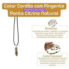 Colar Cordão com Pingente Ponta Citrino Natural Colar Cordão com Pingente de Citrino Natural Este colar com cordão e pingente de citrino natural é uma peça encantadora que combina a beleza do citrino com suas poderosas propriedades energéticas. O citrino é uma pedra conhecida por sua capacidade de atrair prosperidade, vitalidade e alegria. Ao ser como pingente, ele não só embeleza o visual, mas também serve como um amuleto que estimula a criatividade, promove o otimismo e fortalece o espírito de abundância. Benefícios Energéticos: Atração de Prosperidade e Abundância: O citrino é frequentemente chamado de pedra da prosperidade, pois é amplamente reconhecido por sua capacidade de atrair riquezas e oportunidades, ajudando a promover o sucesso financeiro e o crescimento pessoal. Renovação Energética e Vitalidade: Esta pedra é ideal para quem busca aumentar a energia vital e a motivação. O citrino traz uma sensação de renovação, estimulando a vitalidade e o entusiasmo, ajudando o portador a enfrentar os desafios com otimismo e determinação. Equilíbrio Emocional e Alegria: O citrino é uma excelente pedra para elevar o ânimo e combater sentimentos negativos. Ele ajuda a liberar o medo, a ansiedade e a tristeza, promovendo uma sensação de alegria, confiança e otimismo, além de fortalecer a autoestima. Por serem 100% naturais, as pedras podem apresentar pequenas variações e imperfeições, o que as torna ainda mais únicas e autênticas. Enviamos em até 24 horas após a confirmação do pagamento Se você tiver alguma dúvida, não hesite em nos mandar uma mensagem Responderemos rapidamente para ajudá-lo da melhor forma possível Marca: Não Informado
