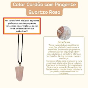 Colar Cordão com Pingente Quartzo Rosa Natural Colar Cordão com Pingente de Quartzo Rosa Natural Este colar com cordão e pingente de quartzo rosa natural é uma peça elegante que une a beleza delicada do quartzo rosa com suas poderosas propriedades energéticas. O quartzo rosa, conhecido como a pedra do amor, é amplamente reconhecido por sua capacidade de promover o amor incondicional, a harmonia e a cura emocional. Ao ser como pingente, além de embelezar o visual, ele também serve como um amuleto que favorece o equilíbrio emocional e fortalece os laços de amor e compaixão. Benefícios Energéticos: Atração e Fortalecimento do Amor: O quartzo rosa é famoso por sua associação com o amor, sendo eficaz para atrair e fortalecer o amor próprio, o amor romântico e o amor entre familiares e amigos. Ele ajuda a abrir o coração para receber e oferecer amor incondicional. Cura Emocional e Harmonia: Esta pedra é uma excelente aliada para promover a cura emocional, ajudando a liberar mágoas, traumas e sentimentos de insegurança. Ela traz uma sensação de paz interior, favorecendo a harmonia nas relações e proporcionando serenidade no cotidiano. Equilíbrio e Paz Interior: O quartzo rosa tem a capacidade de equilibrar as emoções, aliviando o e a ansiedade. Ele também proporciona uma sensação de segurança e bem-estar, ajudando o portador a lidar com os desafios da vida com mais calma e confiança. Por serem 100% naturais, as pedras podem apresentar pequenas variações e imperfeições, o que as torna ainda mais únicas e autênticas. Enviamos em até 24 horas após a confirmação do pagamento Se você tiver alguma dúvida, não hesite em nos mandar uma mensagem Responderemos rapidamente para ajudá-lo da melhor forma possível Marca: Não Informado