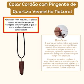 Este colar com cordão e pingente de quartzo vermelho natural é uma peça impressionante que combina a beleza vibrante do quartzo vermelho com suas poderosas propriedades energéticas. O quartzo vermelho é uma pedra de força e vitalidade, conhecida por estimular a energia física, a coragem e a paixão. Ao ser utilizado como pingente, ele não só adiciona um toque elegante ao visual, mas também serve como um amuleto que promove motivação, equilíbrio e autoconfiança.