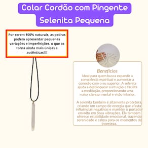 Este colar com cordão e pingente de selenita pequena natural é uma peça delicada e energética, ideal para quem busca um toque de luz e equilíbrio no seu dia a dia. A selenita é uma pedra poderosa, conhecida por suas propriedades de purificação, proteção e elevação espiritual. Ao ser usada como pingente, além de ser um acessório elegante, ela também age como um amuleto que traz clareza, tranquilidade e auxilia na limpeza energética do ambiente e do portador.