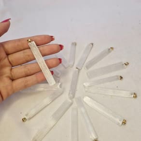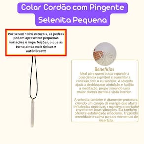 Colar Cordão com Pingente Selenita Pequena Colar Cordão com Pingente de Selenita Pequena Natural Este colar com cordão e pingente de selenita pequena natural é uma peça delicada e energética, ideal para quem busca um toque de luz e equilíbrio no seu dia a dia. A selenita é uma pedra poderosa, conhecida por suas propriedades de purificação, proteção e elevação espiritual. Ao ser Utilizado como pingente, além de ser um acessório elegante, ela também age como um amuleto que traz clareza, tranquilidade e auxilia na limpeza energética do ambiente e do portador. Benefícios Energéticos: Purificação e Limpeza Energética: A selenita é uma das pedras mais eficazes na purificação e limpeza de energias negativas. Ela tem o poder de limpar a aura e os chakras, promovendo um fluxo energético mais harmonioso e equilibrado. Apoio ao Crescimento Espiritual: Esta pedra é ideal para quem busca expandir a consciência espiritual e aumentar a conexão com o eu superior. A selenita ajuda a desbloquear a intuição e facilita a meditação, proporcionando uma maior clareza mental e visão interior. Proteção e Estabilidade: A selenita também é altamente protetora, criando um campo de energia que afasta influências negativas e mantém o portador envolto em boas vibrações. Ela também oferece estabilidade emocional, trazendo serenidade e calma para os momentos de incerteza. Por serem 100% naturais, as pedras podem apresentar pequenas variações e imperfeições, o que as torna ainda mais únicas e autênticas. Enviamos em até 24 horas após a confirmação do pagamento Se você tiver alguma dúvida, não hesite em nos mandar uma mensagem Responderemos rapidamente para ajudá-lo da melhor forma possível