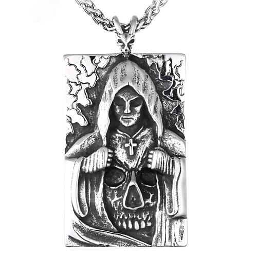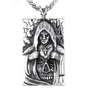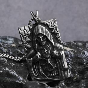 O colar "Anjo da Morte" em aço inoxidável é uma peça impactante e detalhada que captura a essência sombria e misteriosa do ceifador. O pingente apresenta a figura de um anjo encapuzado, conhecido como o Anjo da Morte, envolto em um manto que cobre a maior parte de seu corpo. Seu rosto está oculto pelas sombras do capuz, criando um ar de mistério e poder.