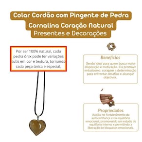 Colar Cordão Pingente de Pedra Cornalina Coração Natural Colar Cordão com Pingente de Pedra Cornalina Coração Natural Este colar encantador com cordão e pingente de pedra cornalina em formato de coração é a combinação perfeita de beleza e energia positiva. A cornalina é uma pedra poderosa conhecida por sua capacidade de revitalizar o corpo e a mente, trazendo vitalidade e paixão à vida de quem a usa. Como pingente, ela não só adiciona um toque de charme ao visual, mas também atua como um amuleto que estimula a criatividade, aumenta a confiança e promove o amor próprio.