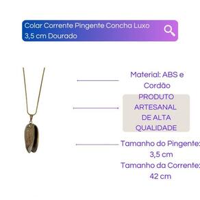 Colar Corrente Pingente Concha Luxo 3,5 cm Dourado Colar Corrente Pingente Concha Luxo 3,5 cm Dourado O Colar Corrente Pingente Concha Luxo da Bialluz é confeccionada em Zamac garantindo alta resistência e durabilidade. A corrente possui 42 cm de comprimento, mas é totalmente regulável podendo ser Utilizado por qualquer pessoa, além de contar com um pingente maravilhoso que emanará ótimas energias em sua vida. É uma maravilhosa opção de presente, com certeza a pessoa que receberá sentirá muita gratidão por ter uma peça tão bela. Enviamos o seu produto em até 24 horas após a confirmação de pagamento Dimensões aproximadas: Comprimento da corrente: 42 cm Comprimento do pingente: 3,5 cm Material: Liga de Zinco em camadas Caso tenha alguma dúvida nos mande mensagem que respondemos rapidinho para te ajudar da melhor forma possível Marca: Não Informado