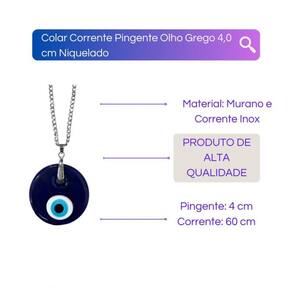 Colar Corrente Pingente Olho Grego 4,0 cm Niquelado Protege do mau olhado, do alvo da inveja e traz boa sorte. DESCRIÇÃO Tamanho do Pingente: 4,0 centímetros Tamanho da Corrente: 60 centímetros Material: Liga de Zinco em camadas Fecho de mosquetão Cuidado com sua bijuteria: 1 - Evite o contato das peças com produtos químicos e de limpeza em geral, é indicado que você retire sua peça ao manusear estes produtos. Como: Cremes, Shampoo, Detergentes, Perfumes. 2 - O perfume se for aplicado diretamente na peça, pode acabar com o tempo danificando a por conta da presença do álcool em sua composição. 3 - Limpe com sabão neutro e água, evite produtos de limpeza, pode prejudicar a peça. Secar bem com pano macio. Presenteie uma pessoa querida com os nossos produtos. Imagens meramente ilustrativas. Tire todas as suas Dúvidas antes de concluir a compra. Iremos responder o mais breve possível. Embalagem de Envio: Caixa de papelão ondulado, plástico bolha, conforme necessidade do produto. Consulte nossos preços e condições para vendas. Respostas das dúvidas mais frequentes na ordem: R1: Já realizamos milhares de entregas em todo o Brasil, somos especialistas no que fazemos. R2: Assim que seu pedido for despachado, esta plataforma envia para você o código de rastreamento. R3: Enviamos o produto 100% inspecionado e conferido em nosso checkout e são embalados em embalagem de papelão e plástico bolha. R5: Iremos despachar o seu produto o mais rápido possível, assim que for confirmado pela plataforma, enviamos em até 24h. R6: Nós queremos a sua satisfação, qualquer problema iremos te auxiliar em nossos canais de comunicações. Marca: Lua Mística - 100% Original - Loja Oficial Ean: 7890003935460