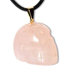 Nome da Pedra: Quartzo Rosa. Cor da Pedra: Rosa suave, translúcido (vide foto). Formato da Pedra: Escultura artesanal em formato de crânio humano. Claridade da Pedra: Brilhante e vítreo, com translucidez natural. Dimensões do Pingente: Aproximadamente 15 a 20 mm. Peso Total da Joia: 25 ct. Montagem: Pino e presilha dourada com perinha para corrente. Cordão: Fio encerado preto com fecho ajustável e corrente; fecho lagosta niquelado. Comprimento do Cordão: 50 cm (3 mm de largura).