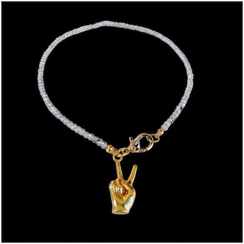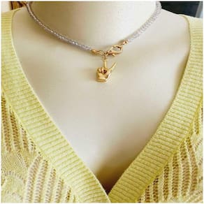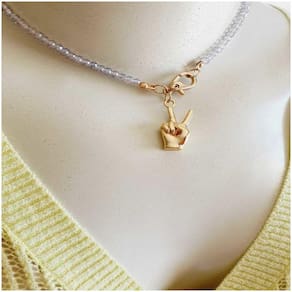 Colar em cristais lilás claro, com feixe na frente com pingente símbolo Mão/Paz.
