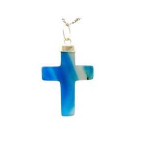 Colar Crucifixo de pedra agata natural, envolto em dourado, é um símbolo de força. Beleza e significado em uma só peça.