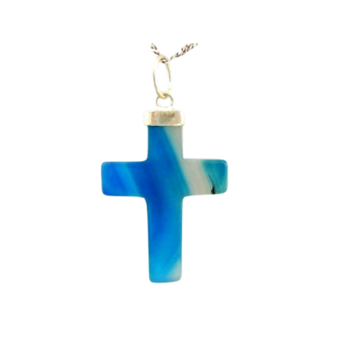 Crucifixo Pingente Pedra Agata Tom Natural de Claro a leve Cinza, lapidação em Cruz totalmente artesanal com polimento, a montagem é feita envolto em dourado.