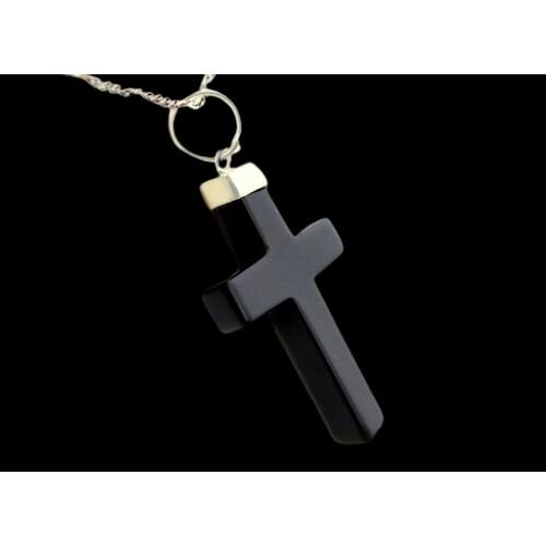 Crucifixo Pingente Pedra Onix Preto, lapidação em Cruz totalmente artesanal com polimento, montagem é feita em volto Prateado.