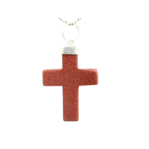 Colar Crucifixo de pedra do sol, envolto em prateado, símbolo da fé e da riqueza divina, encanta os olhos e os corações dos fiéis.