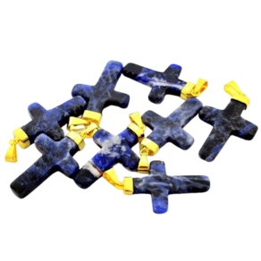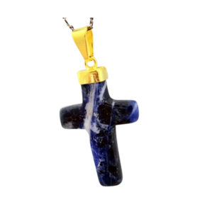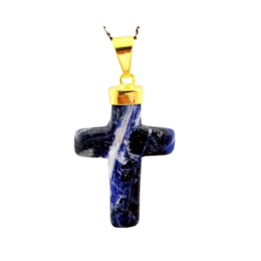 Este colar de crucifixo com pedra natural de sodalita azul é uma peça única e elegante, com montagem envolto em dourado.