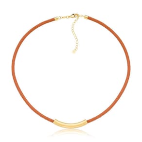 Este colar foi elaborado em Couro Natural, na cor caramelo, com um lindo acessório canutilho curto que acompanha a forma circular da peça. Com metais revestidos em ouro, seu design sofisticado une conforto e beleza, tornando uma peça atemporal e única, de alta durabilidade. Uma linda opção para presentear!