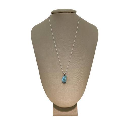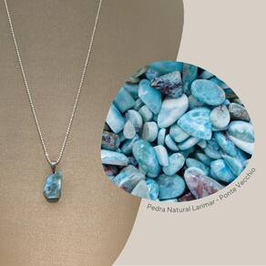 O pingente Larimar exibe um azul celeste com padrões brancos, capturando a serenidade do céu e do mar em uma única gema.