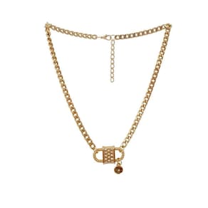 Colar de corrente e pingentes em metal dourado.