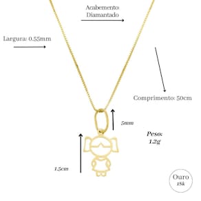 Seja bem-vindo(a) ao grupo DR Joias _x005F_x005F_x005F_x005F_x005F_x005F_x005F_x000D_ _x005F_x005F_x005F_x005F_x005F_x005F_x005F_x000D_ A DR joias traz a segurança que você precisa para comprar a sua joia online. Somos especializados em joias de Ouro 18k e de Prata 925, com experiência de quase 10 anos em vendas pela internet. _x005F_x005F_x005F_x005F_x005F_x005F_x005F_x000D_ _x005F_x005F_x005F_x005F_x005F_x005F_x005F_x000D_ Temos uma grande variedade de produtos para agradar a todos os estilos, proporcionando o que há de melhor em joias. Procuramos ir além de atender as suas necessidades, queremos superar as suas expectativas!!!_x005F_x005F_x005F_x005F_x005F_x005F_x005F_x000D_ _x005F_x005F_x005F_x005F_x005F_x005F_x005F_x000D_ Todos os nossos produtos, possuem certificado de garantia de autenticidade do material, que podem ser testados e comprovados em qualquer joalheria do Brasil._x005F_x005F_x005F_x005F_x005F_x005F_x005F_x000D_ Descrição da Corrente Feminina em Ouro 18k:_x005F_x005F_x005F_x005F_x005F_x005F_x005F_x000D_ Tamanho da corrente: 50cm_x005F_x005F_x005F_x005F_x005F_x005F_x005F_x000D_ Largura da corrente: 0,55 mm_x005F_x005F_x005F_x005F_x005F_x005F_x005F_x000D_ Peso total: 1.20 gramas_x005F_x005F_x005F_x005F_x005F_x005F_x005F_x000D_ Material: Ouro 18k_x005F_x005F_x005F_x005F_x005F_x005F_x005F_x000D_ Forma: MaciçaTamanho do Pingente: 1.5cm (Com o Passador)_x005F_x005F_x005F_x005F_x005F_x005F_x005F_x000D_ Acompanha embalagem para guardar a sua joia.O destaque desta deslumbrante peça de joalheria é o encantador pingente em forma de menina. A menina é meticulosamente esculpida, capturando sua graça e inocência de forma inigualável._x005F_x005F_x005F_x005F_x005F_x005F_x005F_x000D_ Ouro 18k é um metal precioso altamente valorizado por sua durabilidade, beleza e brilho. Joias feitas com ouro 18k apresentam 75% de ouro puro combinado com outros metais, produzidas em uma liga forte e resistente perfeita para uso diário.