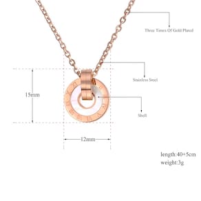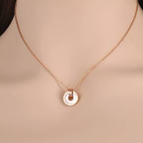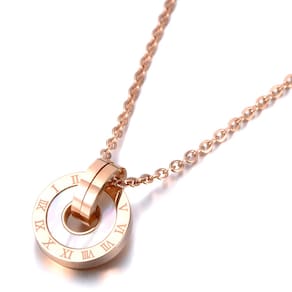 Um colar elegante com pingente banhado a ouro rosé, composto por um círculo adornado com números romanos e duas argolas. Este design sofisticado combina a beleza clássica dos números romanos com a modernidade do ouro rosê, criando uma peça de joalheria atemporal e estilosa. As duas argolas adicionam um toque de originalidade e movimento, tornando este colar uma escolha perfeita para quem aprecia a fusão do tradicional com o contemporâneo. Uma adição encantadora e versátil para qualquer coleção de joias.