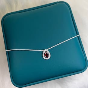 Material: Prata 925 Pedras: Brilhantes cuidadosamente cravejados ao redor de uma pedra central vermelho, criando um contraste encantador Design: Pingente em formato de gota que realça a beleza da pedra central e adiciona um toque de elegância