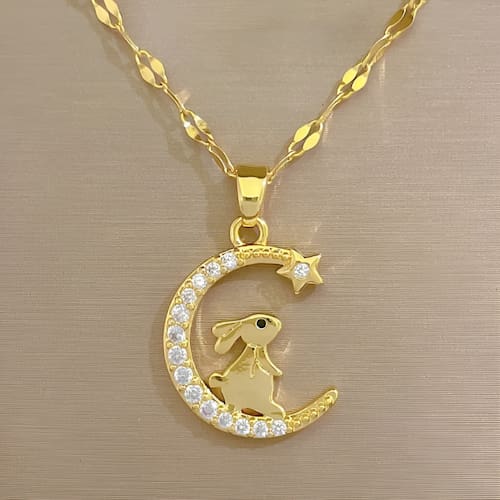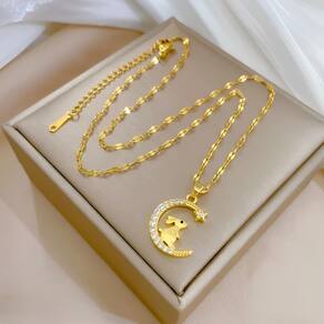 Este colar feminino apresenta um design encantador que combina a silhueta de um coelho com a forma crescente de uma lua, criando uma peça única e cheia de significado. O coelho, um símbolo de fertilidade e renovação, é delicadamente posicionado como se estivesse alcançando ou repousando sobre a curva da lua, evocando imagens de sonhos e aspirações.