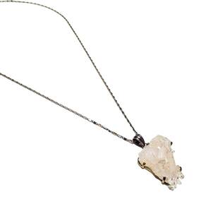 Colar feito com cristal de Quartzo e detalhes em metal com banho prateado. Peça trabalhada à mão. Pingente com aproximadamente 5cm. Confortável e leve, a corrente possui 50cm de circunferência. Acabamento de qualidade. Peso: 15g Design exclusivo.