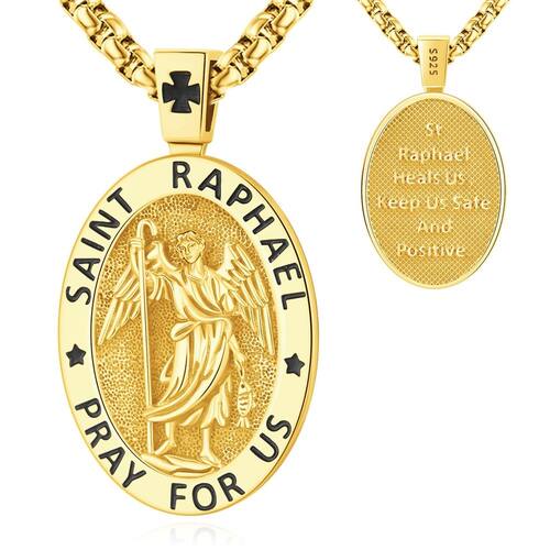- Material: São Rafael, o Arcanjo é o santo padroeiro dos viajantes, profissionais médicos e aqueles que estão doentes. Os pingentes St Raphael são feitos de prata esterlina S925, corrente de aço inoxidável de 3 mm, design requintado e exclusivo