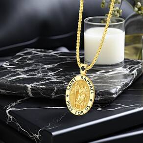 - Design: o Arcanjo São Rafael pode proteger a saúde, a alma e o espírito. O colar St. Raphael apresenta a figura do Arcanjo São Rafael na frente e a inscrição "Saint Raphael Pray For Us". O verso do pingente Arcanjo gravou "St Raphael Heals Us", Keep Us Safe And Positive