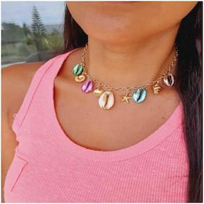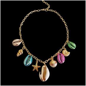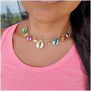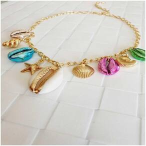 Colar em corrente douradas com pingentes dourados e búzios coloridos.
