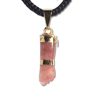Proteja-se com estilo! Nosso mini pingente de figa em quartzo rosa é o amuleto perfeito para afastar energias negativas e atrair boas vibrações. Compacto e elegante, ele combina com qualquer look, trazendo proteção e elegância em um só acessório. Adquira já o seu e sinta a diferença! O que irá receber: 1- Colar com Pingente em pedra Natural pronto para uso Detalhes do Cordão ou Colar: Cordão ou Colar, feito de fio encerado preto com fecho ajustável com corrente Fecho Lagosta (Niquelado) Dimensões: 50 cm comprimento x 3 mm largura Peso aproximado:1,2 gramas (Leve) Detalhes do Pingente: Figa Mini Pingente Montagem Dourada Amuleto da sorte Pedra quartzo goiba , lapidação totalmente artesanal com polimento por vibração a montagem é feita emvolto da peça com Lapidação suave não machuca quando estiver usando NOME DAS PEDRAS: Quartzo Goiaba COR DAS PEDRAS: Vide Foto CORTE DAS PEDRAS: Figa Amuleto com Polimento Vibrado CLARIDADE DAS PEDRAS: Brilhoso MEDIDA DAS PEDRAS: 20mm em média PESO TOTAL DA JOIA: 05 Quilates METAL: Niquelado dourado ORIGEM: Montagem Curvelo MG Por ser pedra natural, podem apresentar variações em suas tonalidades e grafismos. Há também a possibilidade de ocorrerem pequenas inclusões que irão se assemelhar a fissuras, mas que são normais de minerais autênticos de garimpo. Hidratação com óleo mineral Marca: CristaisdeCurvelo