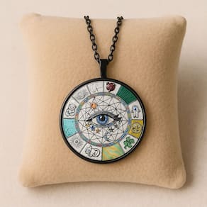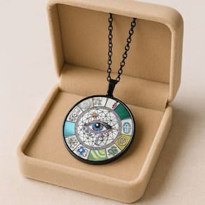 Colar Olho Místico com Pingente Redondo é um acessório cheio de simbolismo e estilo. O pingente circular traz o desenho de um olho centralizado envolto por padrões geométricos e elementos esotéricos coloridos, que remetem à proteção e espiritualidade. A corrente em tom preto contrasta perfeitamente com os detalhes vibrantes do pingente, criando um visual moderno e único. Ideal para quem gosta de acessórios místicos, alternativos ou deseja dar um toque de personalidade ao look.