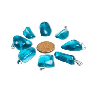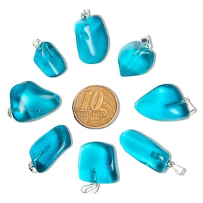 Nome da Pedra: Obsidiana Azul (Pedra sintética) Cor: Preto intenso com brilho vítreo Corte: Natural, apenas polida em rolamento vibratório Clareza: Opaca com brilho vítreo Tamanho da Pedra: 10 a 20mm (variação mínima) Acabamento: Pino preso com furo + perinha dourada para corrente Peso da Pedra: Média 4g