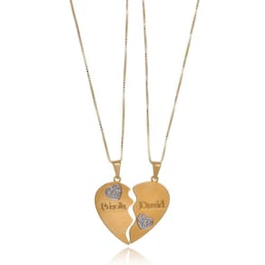 Esse colar foi pensando, especialmente, para aquele casal que as vezes viaja sozinho e sente saudades do namorado. Já pensou em levar um pedaço dele onde você for? Com o Colar Metades que se Completam vocês podem ir em qualquer e sentir a presença um do outro sabendo que o sentimento é mutuo. Folheado em Ouro 18K.