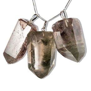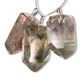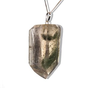 NOME DAS PEDRAS: Cristal Quartzo Natural com Inclusão de Clorita e Lodolita Verde. COR DAS PEDRAS: Cristalino (Foto Ilustrativa). CORTE DAS PEDRAS: Natural Sextavado Gerador, mantendo caracteristicas presentes na peça, mantendo sua originalidade. CLARIDADE DAS PEDRAS: Brilhoso. MEDIDA DAS PEDRAS: 30 a 40mm x 15 a 30mm, podendo ter pequenas variações. CASTOAÇÃO: Pino Preso Sob Furo + Perinha para Corrente em metal, Montagem Prata 950. PESO TOTAL DA JOIA: 20 Quilates com variação para mais ou menos.