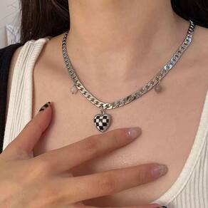 Colar prateado corrente coração xadrez branco preto