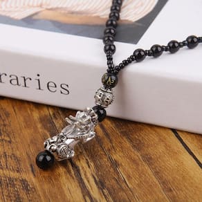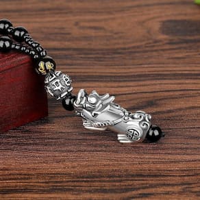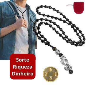 Colar Preto e Prata Riqueza Feng Shui Pixiu Amuleto Sorte Lindo Colar Feng Shui Peso líquido: cerca de 7,2g Aprox. 65cm Acompanha saquinho de veludo. Pixiu, originalmente Bi Xie que evita maus espíritos é uma criatura híbrida da mitologia chinesa. É considerado um poderoso protetor dos praticantes de Feng Shui. Recorda um leão alado e forte. O Pixiu adora ouro, prata, joias, sente seu cheiro de longe e vai atrás para comer ou trazer para seu dono. Como ele só come, mas nunca defeca, ele ficou associado como o guardião da riqueza, pois, se depender dele, só entra, não sai. A imagem do Pixiu é principalmente Utilizado no Anel, colar ou pulseira da Sorte do Feng Shui, que servem como amuleto para atrair dinheiro. Marca: Pjk store Ean: 7896311871575