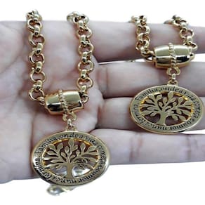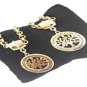 - O tamanho padrão da corrente é 45cm e da pulseira 20cm, mas elas têm um fecho que permite abrir a corrente para ajustar o tamanho ao seu gosto ou para retirar o pingente;