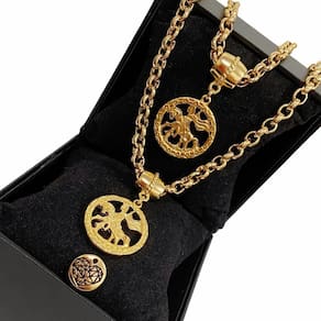- O tamanho padrão da corrente é 45cm e da pulseira 20cm, mas elas têm um fecho que permite abrir a corrente para ajustar o tamanho ao seu gosto ou para retirar o pingente;