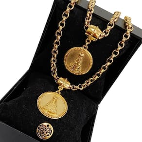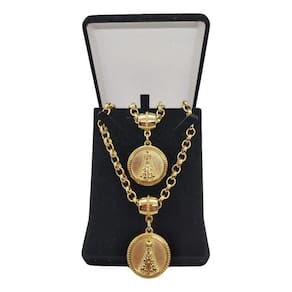 - O tamanho padrão da corrente é 45cm e da pulseira 20cm, mas elas têm um fecho que permite abrir a corrente para ajustar o tamanho ao seu gosto ou para retirar o pingente;