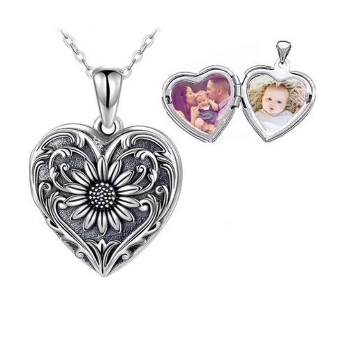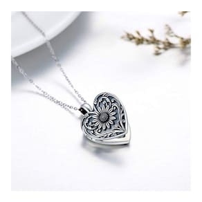 Medalhão excelente e elegante com design de coração e girassol. Em prata esterlina 925.\ nMaterial: Feito de prata esterlina 925, hipoalergênico, não danifica a pele. E a técnica de polimento torna cada detalhe macio e brilhante. Dicas de cuidados com suas joias: guarde suas joias separadamente para evitar arranhões. Fique longe de produtos químicos, sabonetes e piscinas. Creme hidratante, protetores solares e perfumes. Esfregue suas joias com um pano de polimento para recuperar o brilho. Todas as nossas joias têm um tratamento chamado ródio: o banho de ródio ou ródio é um processo de eletrólise por imersão, amplamente utilizado em joias de alta qualidade para acabamentos de alta qualidade. O Rodio é um metal precioso pertencente à família Platinum. Este banheiro oferece às nossas joias maior resistência a arranhões e manchas, além de um acabamento mais brilhante.\ n\ nInformações da embalagem:\ n1 x Relicary Pendant\ n.1 corrente de prata esterlina 925 com caixa de presente de joias de 45 cm.1.