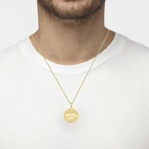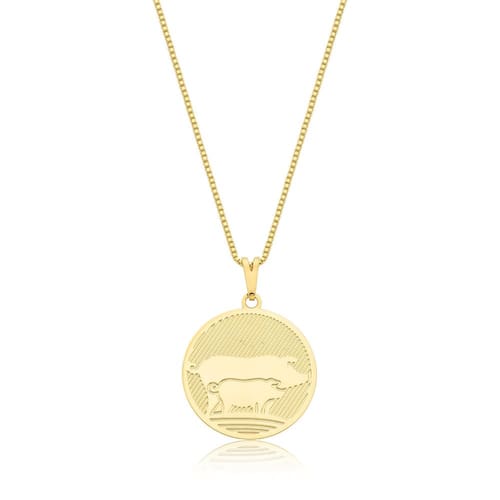 A VL traz o Colar Suinocultura Revestido em Ouro, com uma medalha texturizada e os desenhos do porco e leitão. Modelo unissex.